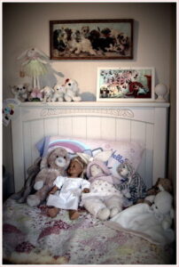 How can I give away Sad Molly, named because of her sad smile? Or Bark Dog? Or Baby Bark Dog? Not Madonna! Certainly not Jewel, named after her favorite musician. Her Aunt Jana gave her Chili, and her Grandma, Bella Bunny. Poodlina just stared at me with those big, black plastic eyes as if pleading me not to pick her and shove her into the bag. How can I?