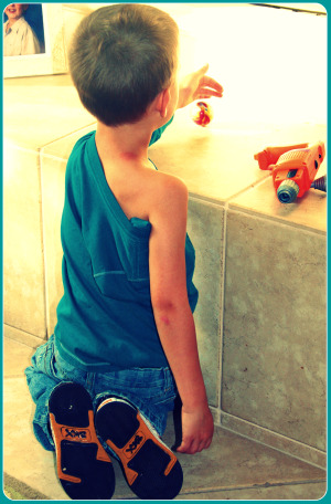 So now So-So’s a fashionista. A trend setter among the five-year-old crowd. Tim Gunn would NOT approve–or maybe he would just tell So-So to “carry on.” When Larry, my husband, came home and saw Ben’s shirt he motioned to me quietly, like “Now, what’s this about?” I just mouthed back “So-So.”